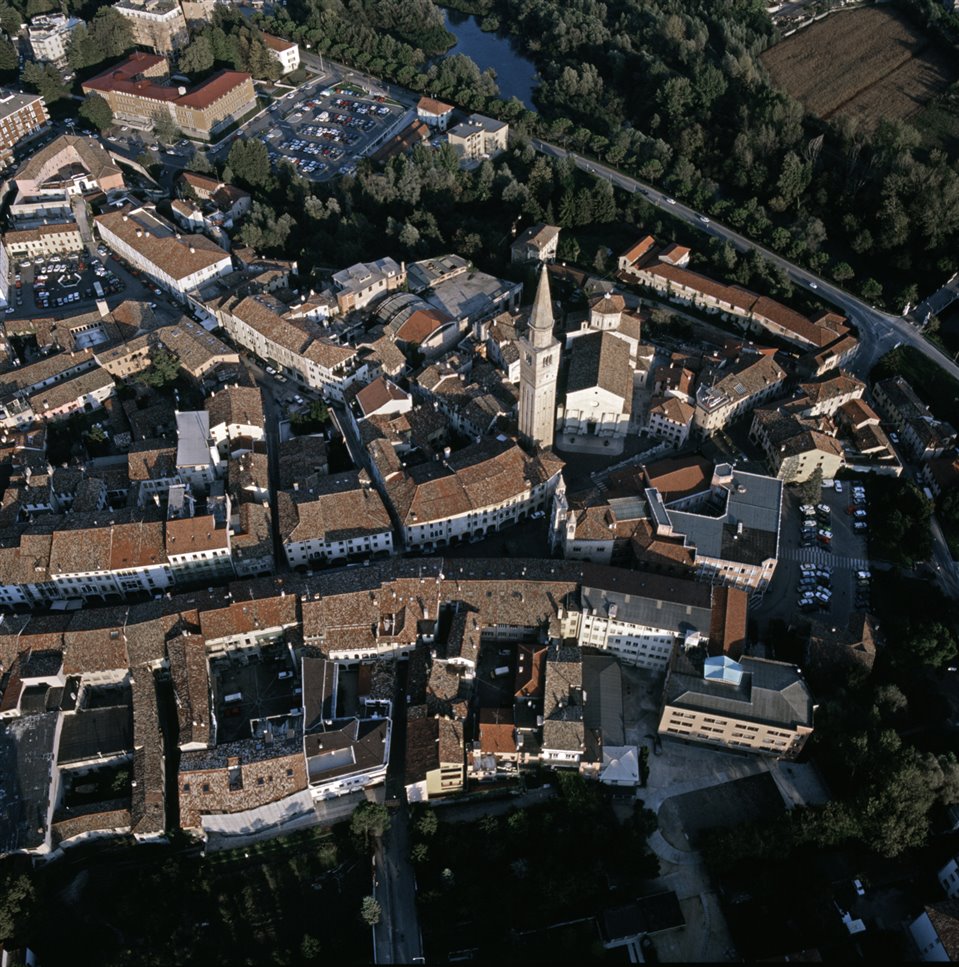 Veduta aerea del centro storico di Pordenone con la chiesa di San Marco (Duomo), il Palazzo Comunale, piazza San Marco e parte di corso Vittorio Emanuele II |