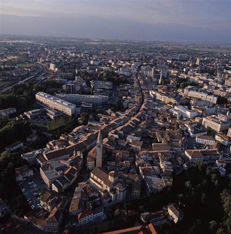 Veduta aerea del centro storico di Pordenone con in primo piano la chiesa di San Marco (Duomo), il Palazzo Comunale, piazza San Marco e corso Vittorio Emanuele II; sulla sinistra parte della linea ferroviaria Udine-Venezia |