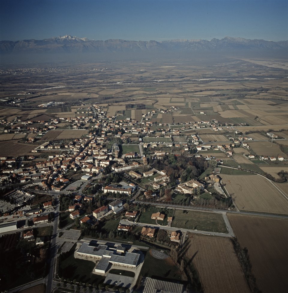 Veduta aerea di Zoppola con sulla destra il Castello di Zoppola; sullo sfondo le Prealpi Carniche |
