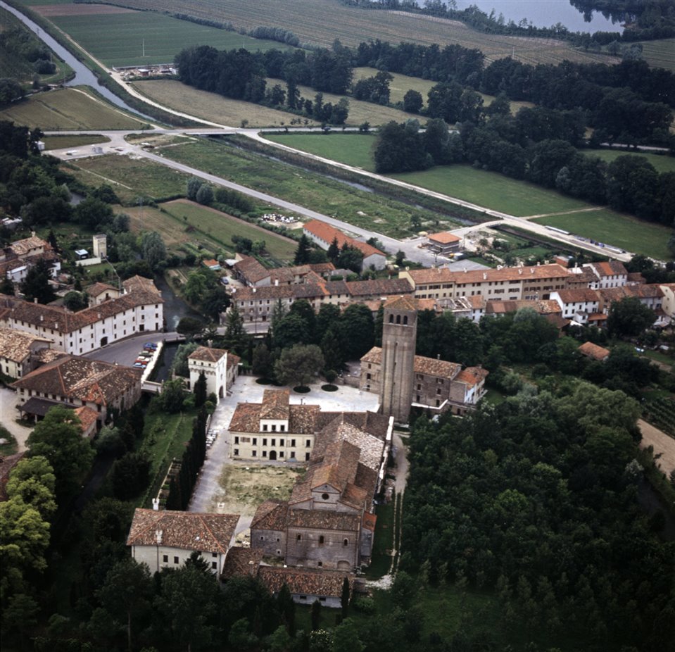 Veduta aerea di Sesto al Reghena con in primo piano l’abbazia benedettina di Santa Maria in Sylvis, il Palazzo del Municipio e in fondo il fiume Reghena |