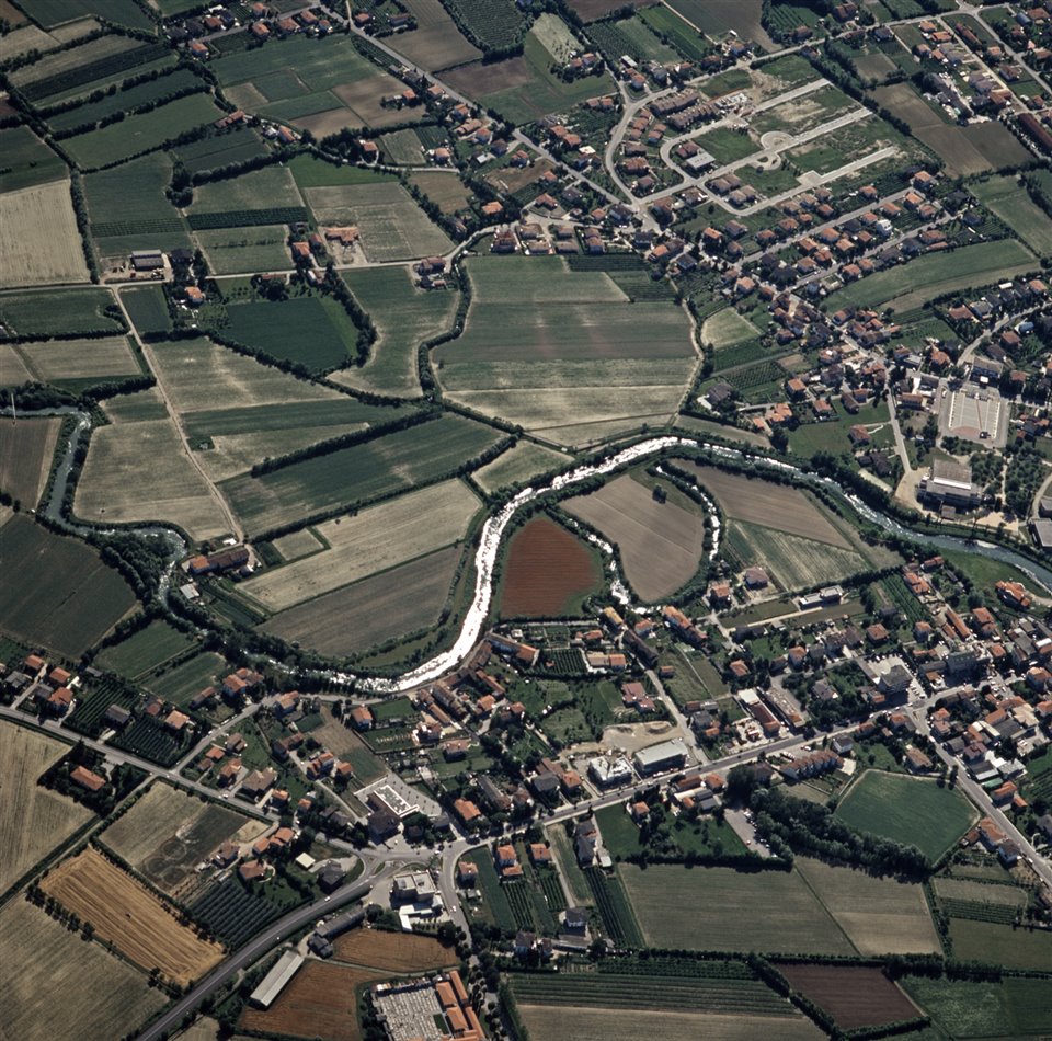Veduta aerea di parte della periferia di Fiume Veneto con il fiume Meduna |