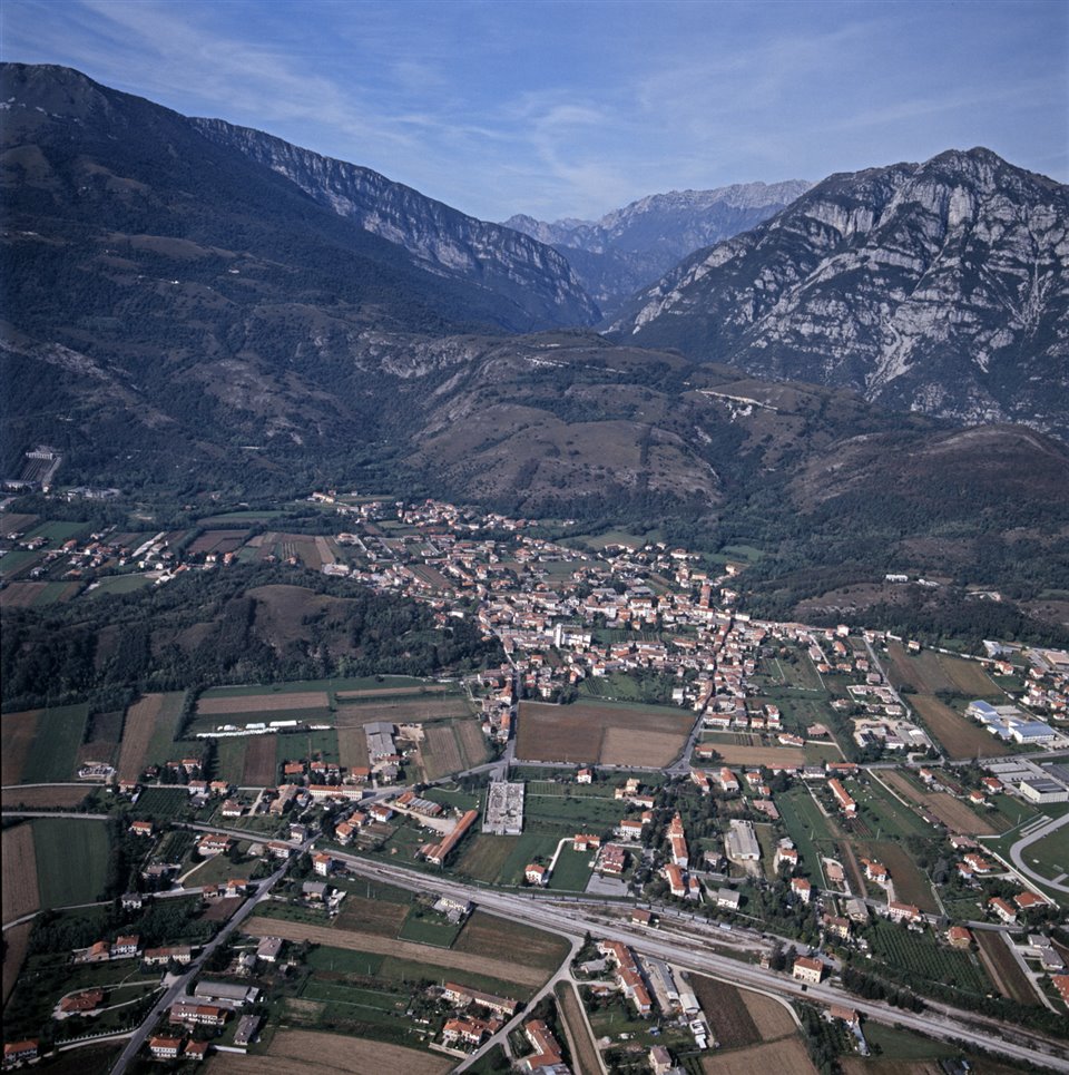 Veduta aerea della frazione di Grizzo nel comune di Montereale Valcellina; sullo sfondo le Prealpi Carniche |