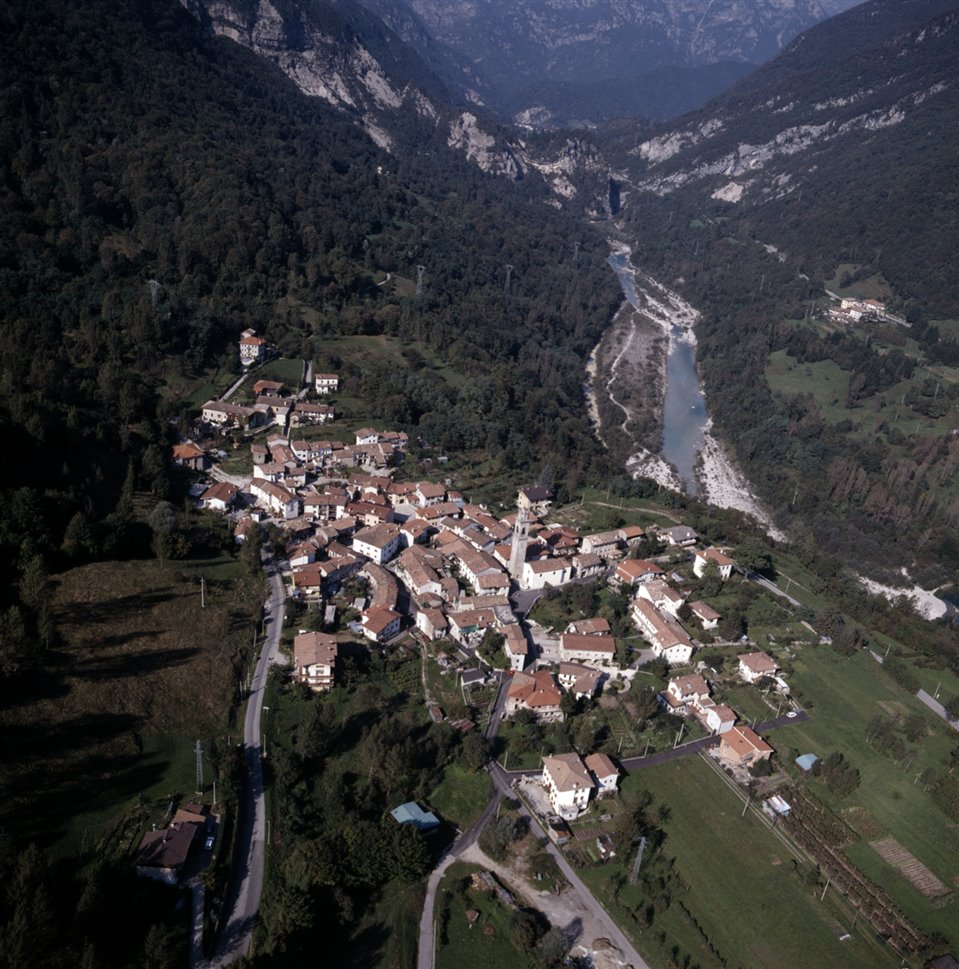 Veduta aerea della frazione di Navarons nel comune di Meduno con la chiesa della Madonna della Salute e un tratto del fiume Meduna |