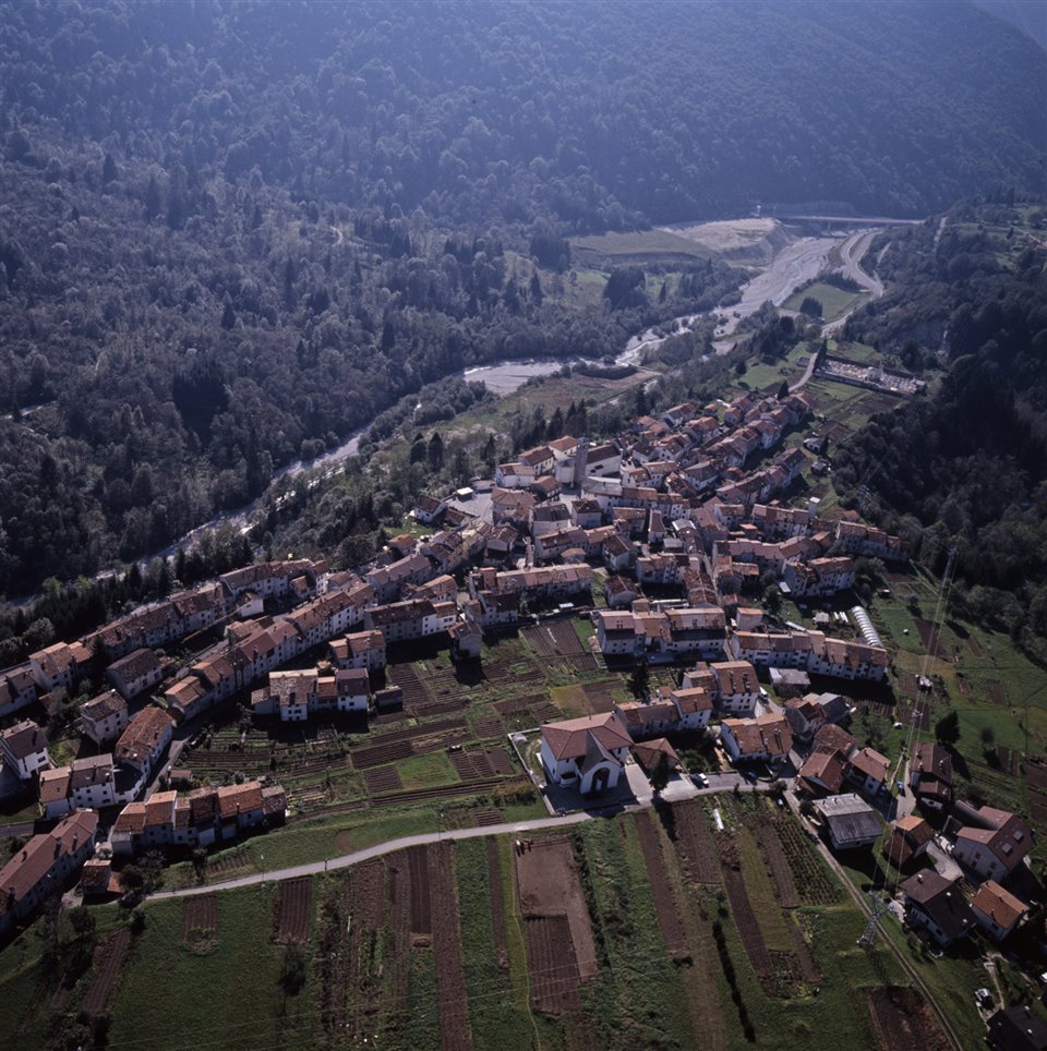 Veduta aerea dell’abitato di Andreis con al centro la chiesa di Santa Maria delle Grazie e il fiume Alba |