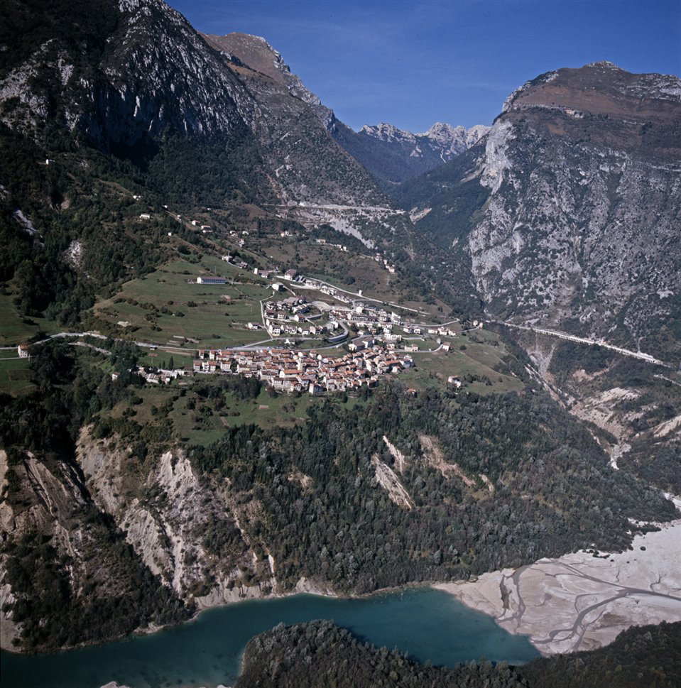 Veduta aerea dell’abitato di Erto e del lago del Vajont; sullo sfondo le Prealpi Carniche |