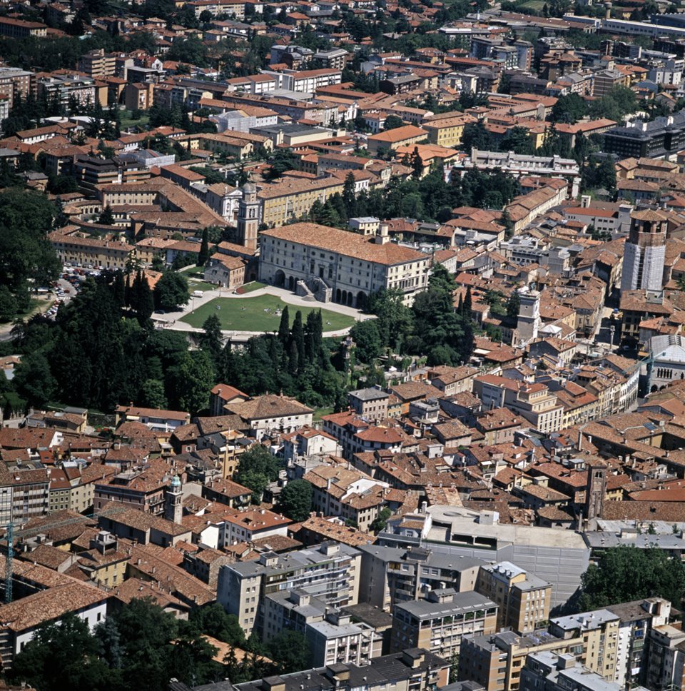 Veduta aerea del centro storico di Udine con al centro il Castello di Udine e la chiesa di Santa Maria di Castello; sulla destra in basso la chiesa di San Pietro Martire e al centro parte della cattedrale di Santa Maria Annunziata (Duomo) |