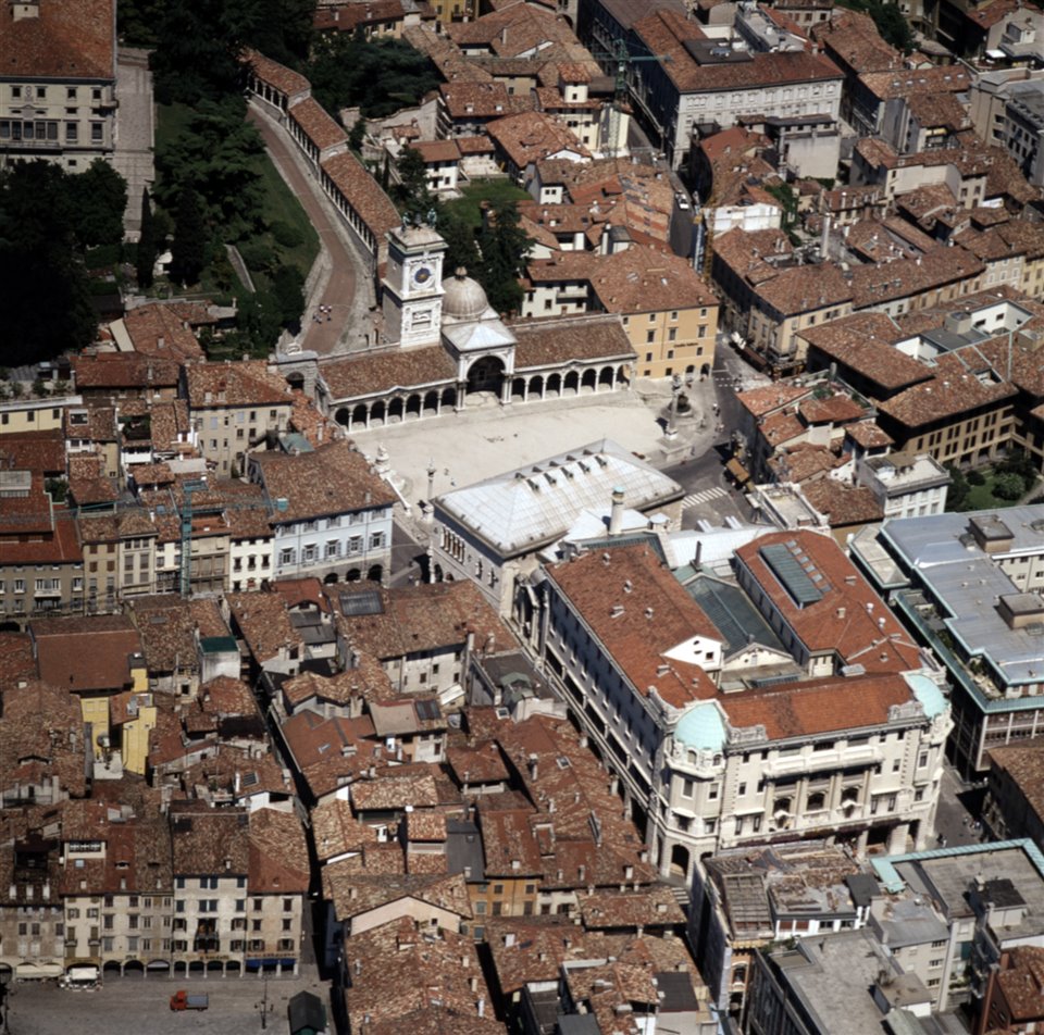 Veduta aerea di parte del centro storico di Udine con al centro la Loggia del Lionello, piazza della Libertà, sulla destra via Daniele Manin e sulla sinistra piazza del Castello in primo piano parte di piazza San Giacomo, via delle Mercerie e sulla destra Palazzo d’Aronco (Comune) |