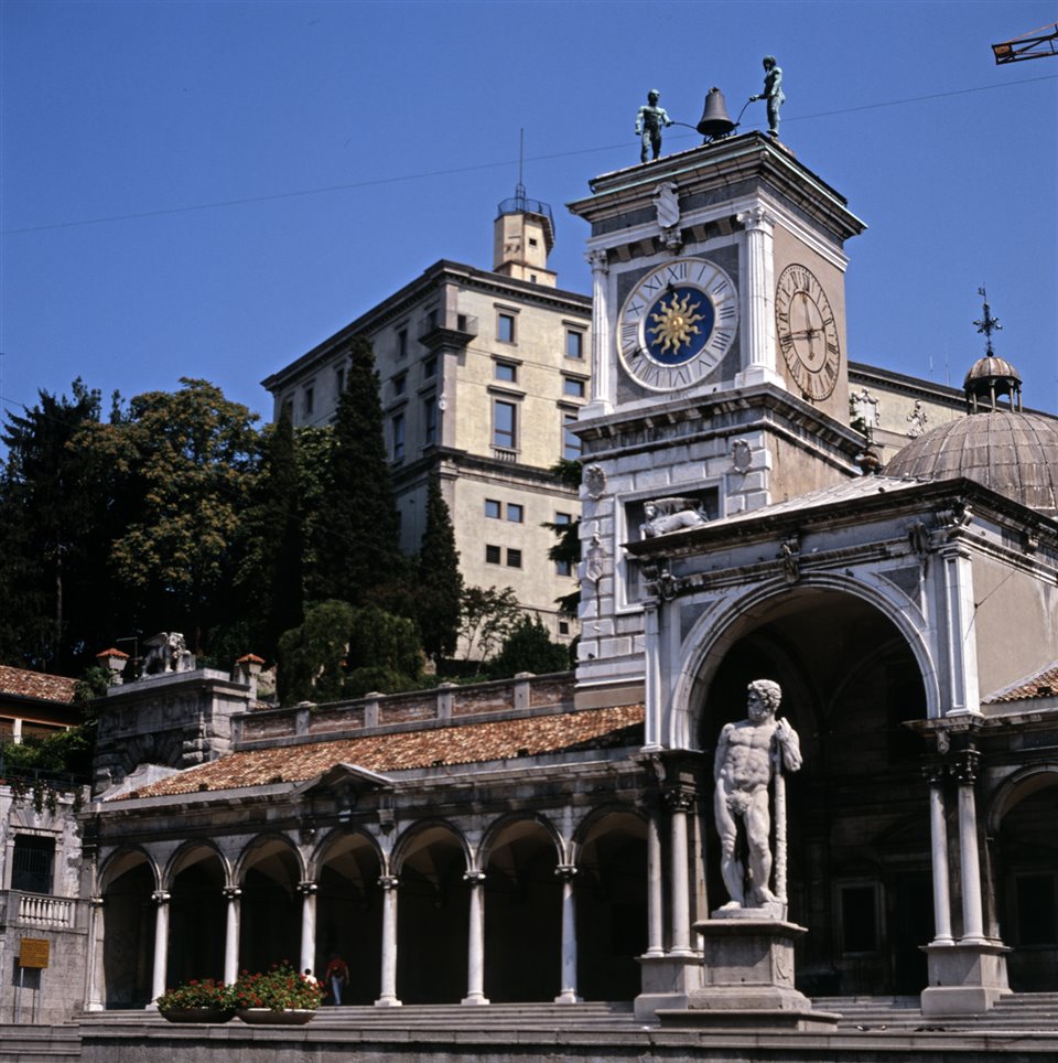 Piazza della Libertà con la statua di Ercole e la Torre dell’Orologio; in fondo il Castello di Udine |