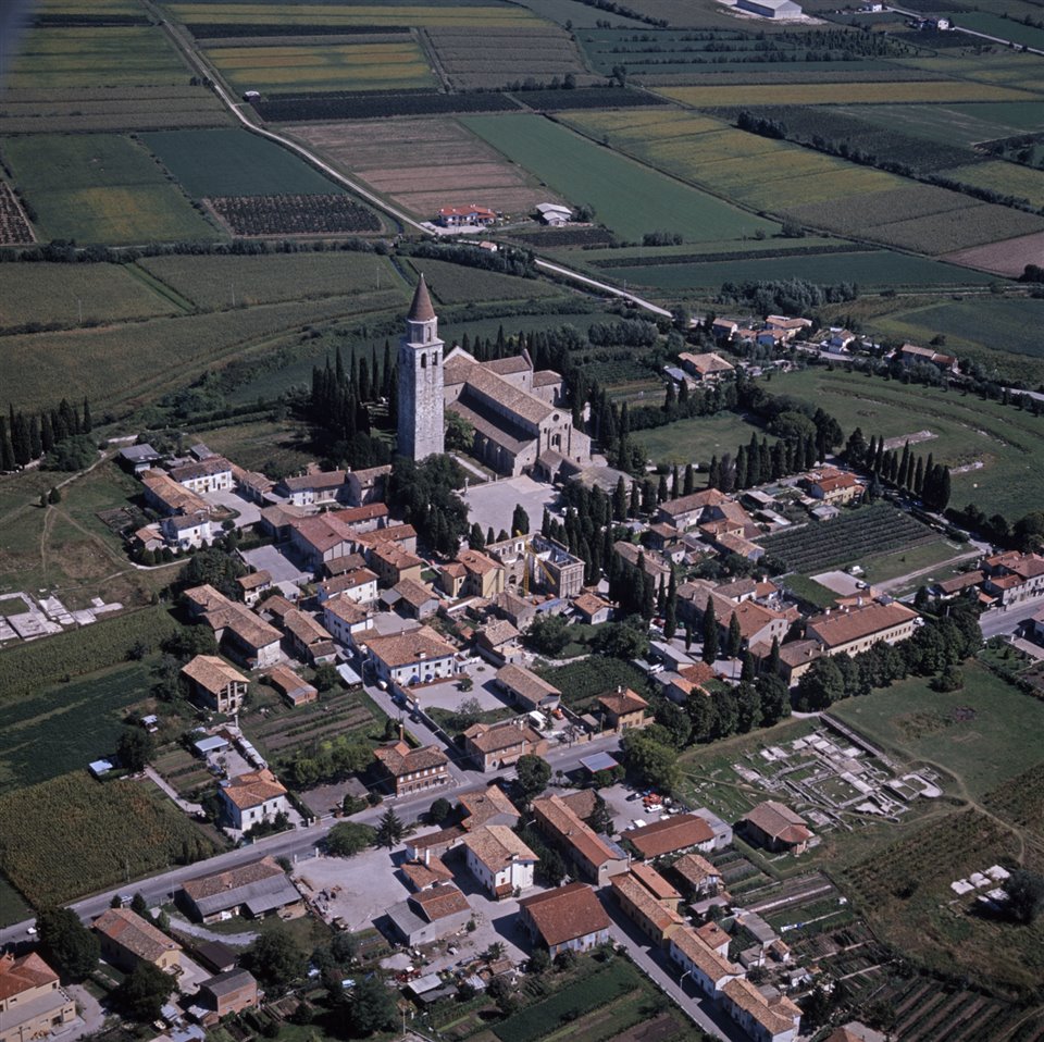 Veduta aerea dell’abitato di Aquileia con la basilica di Santa Maria Assunta, via Julia Augusta e via Teodoro Vescovo |