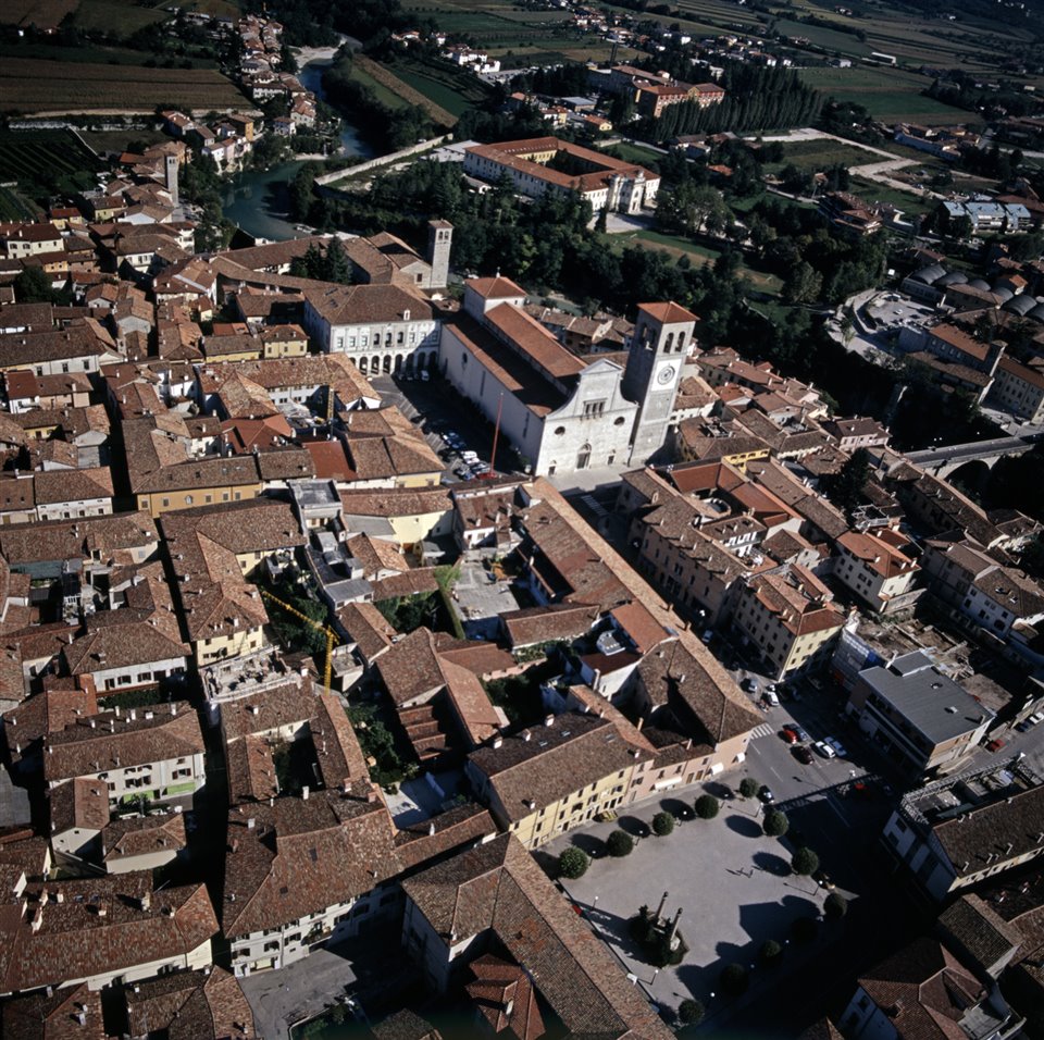 Veduta aerea del centro storico di Cividale del Friuli con sulla destra il fiume Natisone e il ponte del Diavolo. In primo piano la piazza foro Giulio Cesare, al centro il duomo di Santa Maria Assunta, il Museo Archeologico Nazionale, piazza Duomo e la chiesa dei Santi Pietro e Biagio |