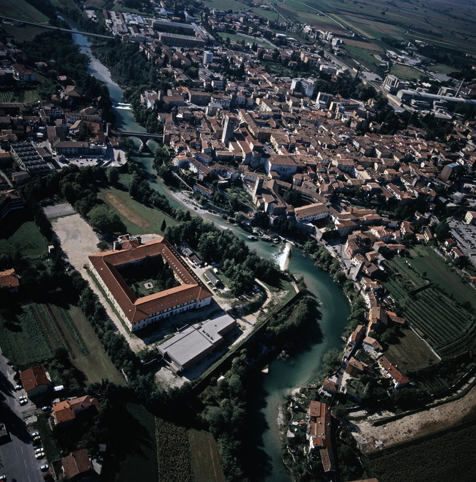 Veduta aerea del centro storico di Cividale del Friuli con il fiume Natisone, il ponte del Diavolo e a sinistra la chiesa di San Martino. Sulla destra il monastero di Santa Maria in Valle, la chiesa dei Santi Pietro e Biagio e il duomo di Santa Maria Assunta |