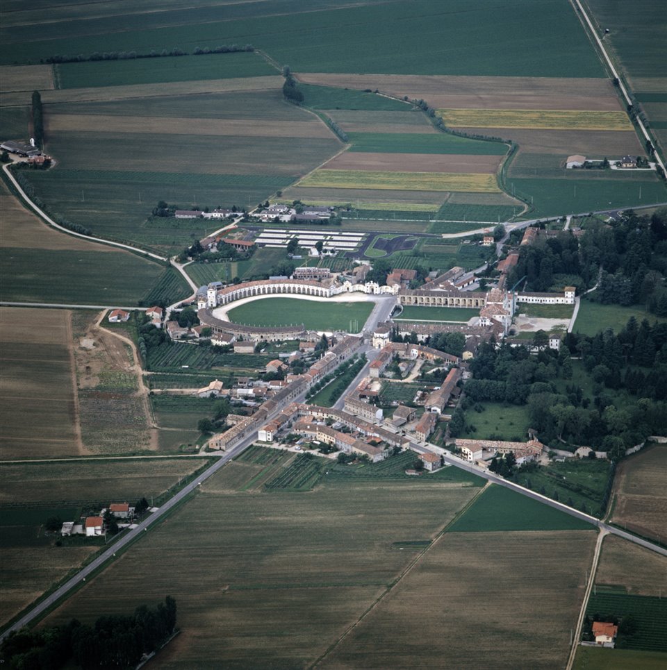 Veduta aerea di Villa Manin nella frazione di Passariano nel comune di Codroipo con un tratto della strada provinciale 65 |
