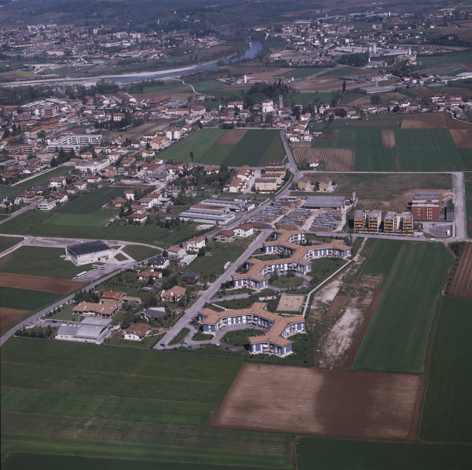 Veduta aerea di parte dell’abitato di San Giovanni al Natisone con via Giuseppe Verdi; al centro la chiesa di San Giovanni Battista e in fondo il fiume Natisone |