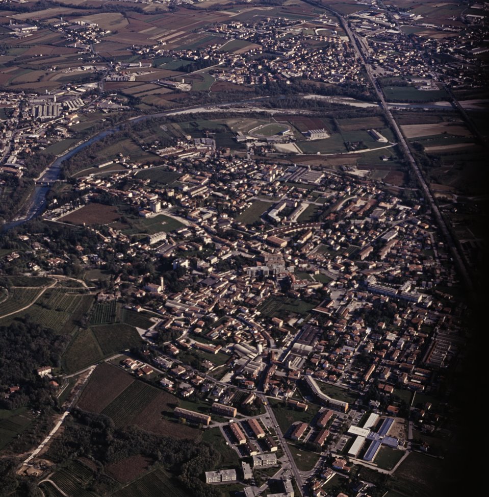 Veduta aerea del territorio di Manzano con l’abitato di Manzano in primo piano, il fiume Natisone e in fondo l’abitato di San Giovanni al Natisone. Sulla destra la linea ferroviaria Udine-Trieste con il ponte ferroviario e la strada regionale 56 con il ponte |