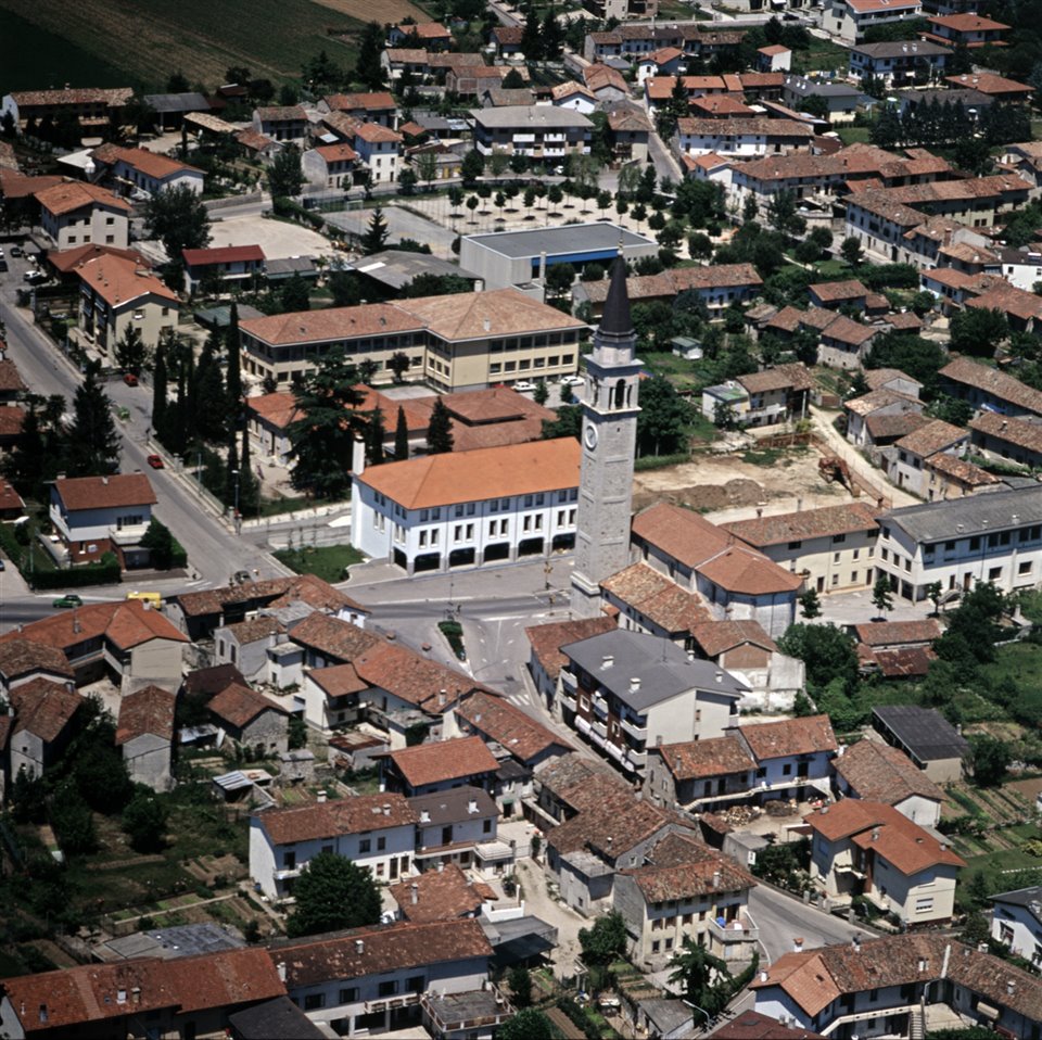 Veduta aerea della chiesa di San Giovanni Battista, via Alcide De Gasperi, via Giacomo Matteotti e via Alberto Picco |