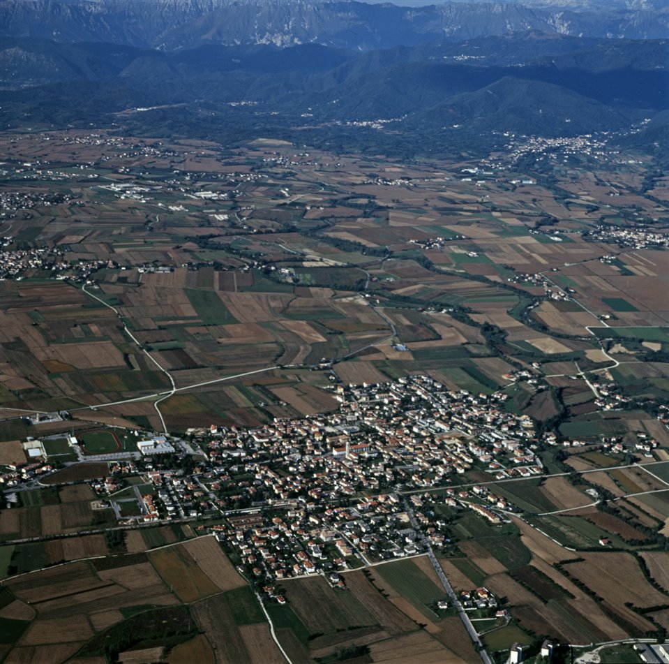 Veduta aerea dell’abitato di Remanzacco con il campo sportivo comunale; sullo sfondo le Prealpi Giulie |