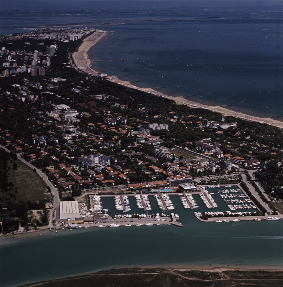 Veduta aerea della città di Lignano Sabbiadoro con la darsena “Marina Uno” e il fiume Tagliamento |