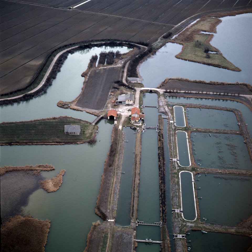 Veduta aerea di parte della laguna di Marano con in primo piano attività di piscicoltura |