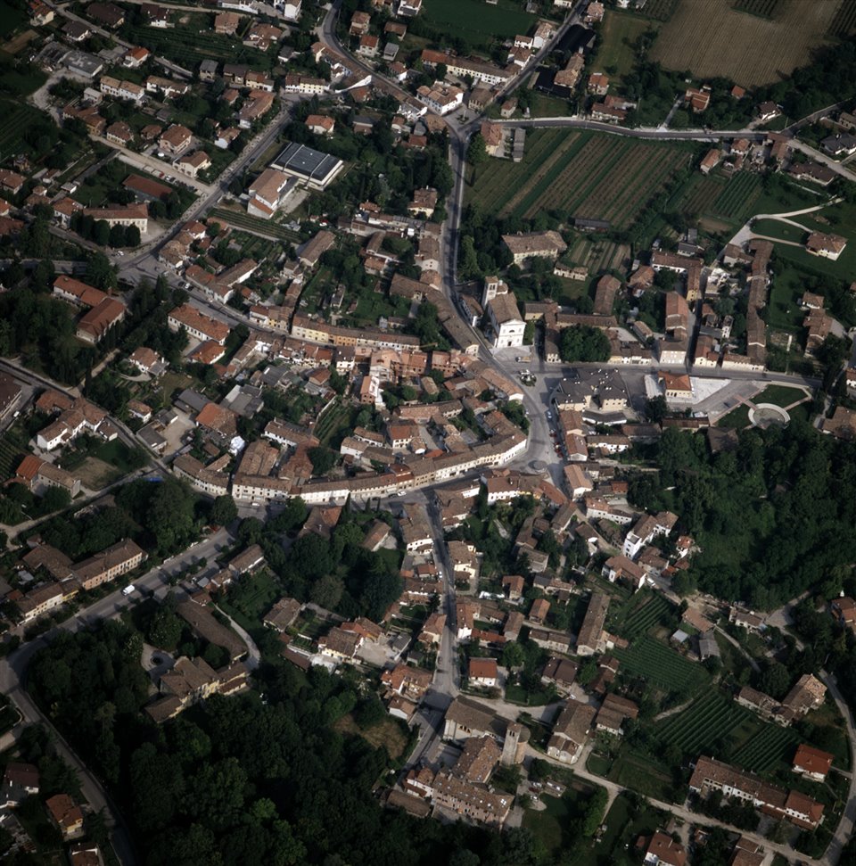 Veduta aerea dell’abitato di Aiello del Friuli con al centro la chiesa di Sant’Ulderico e in basso il convento di San Domenico |