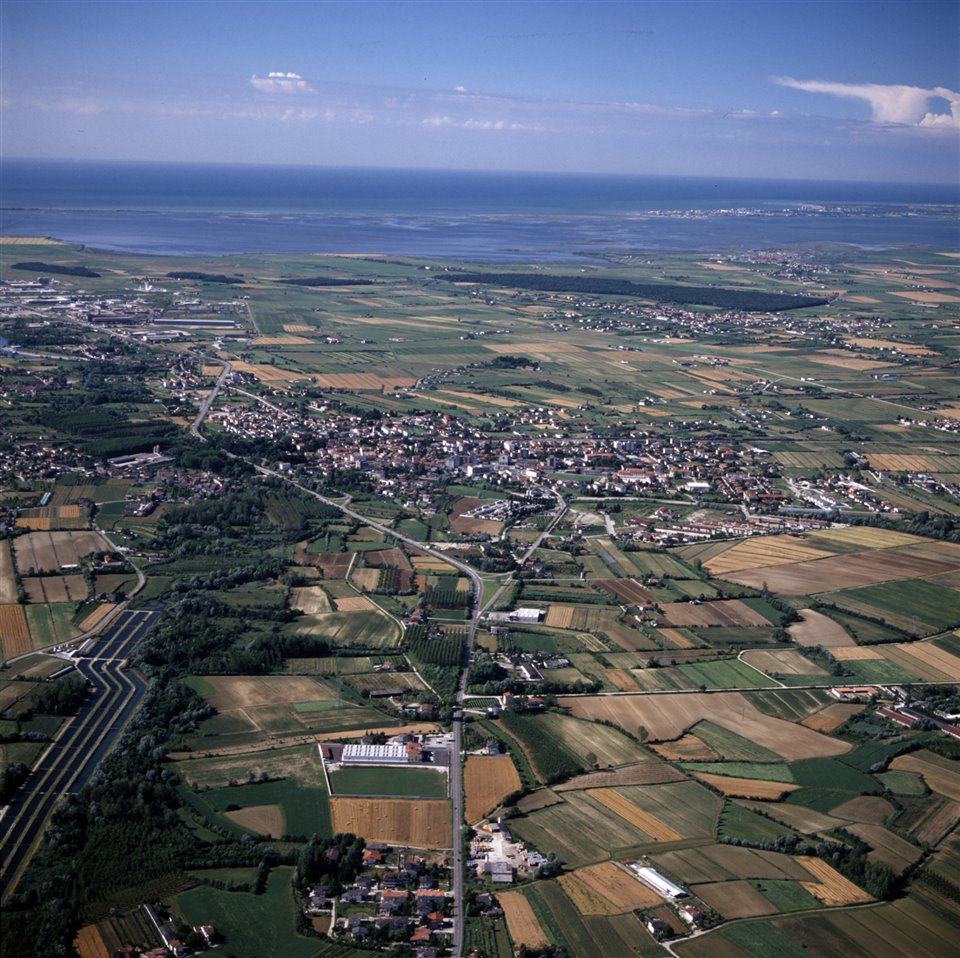 Veduta aerea del territorio di San Giorgio di Nogaro con l’abitato di San Giorgio di Nogaro e sullo sfondo la laguna di Marano |
