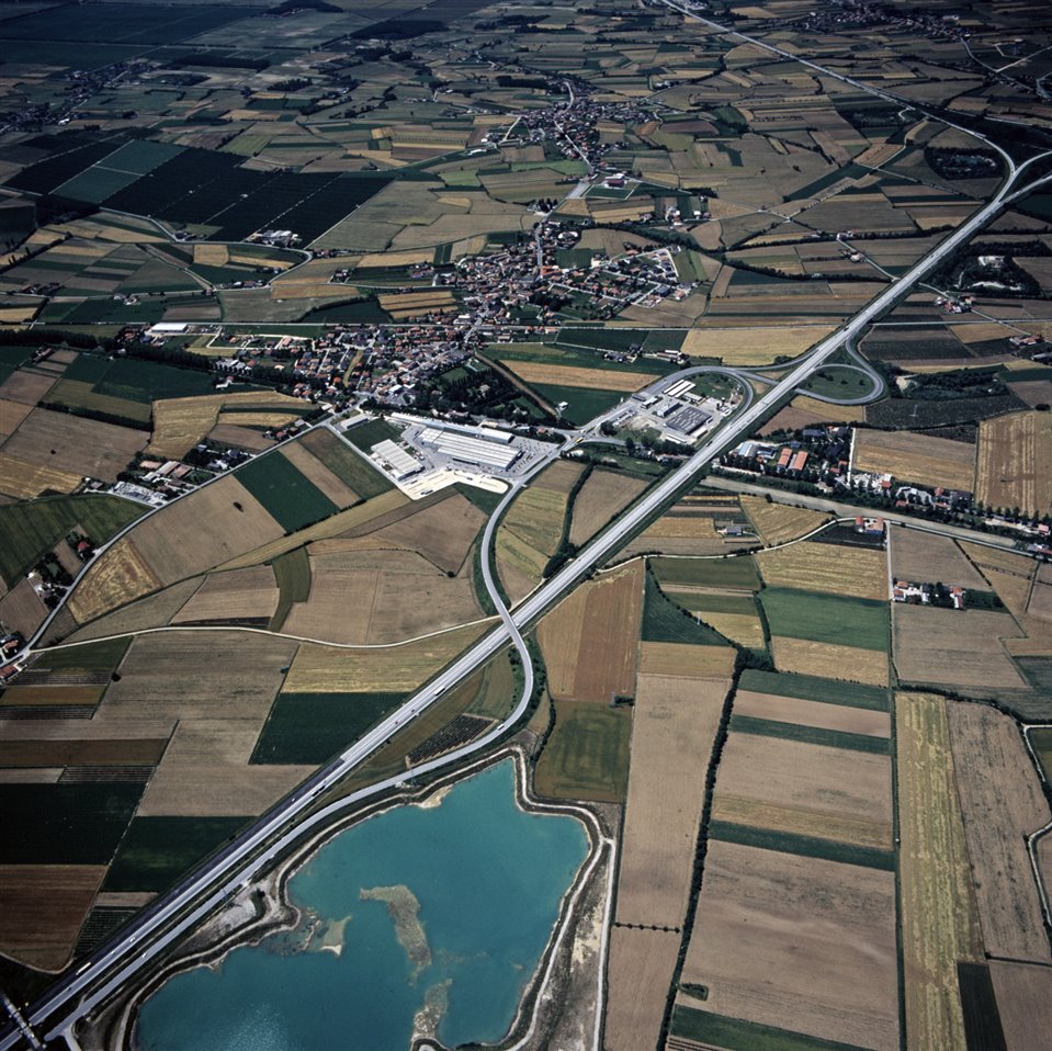 Veduta aerea dell’abitato di Sevegliano con un tratto dell’autostrada A4 Venezia-Trieste |