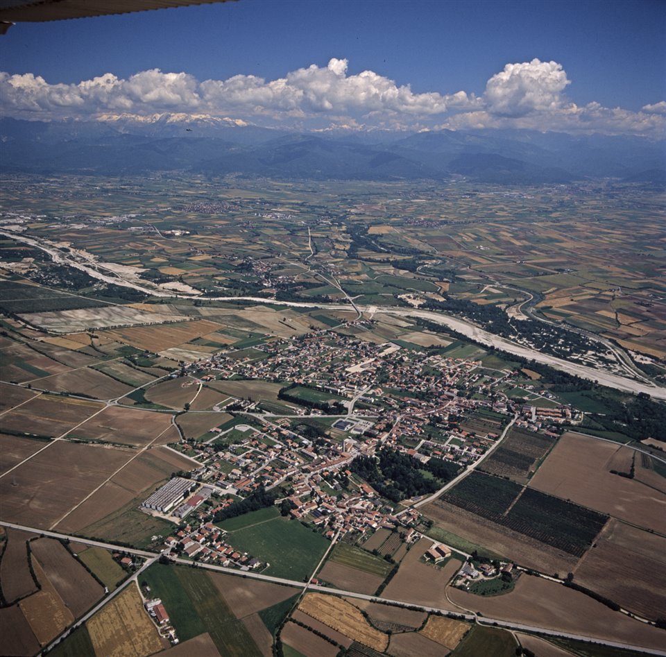 Veduta aerea del territorio di Pradamano con l’abitato di Pradamano e il fiume Torre; sullo sfondo le Prealpi Giulie |