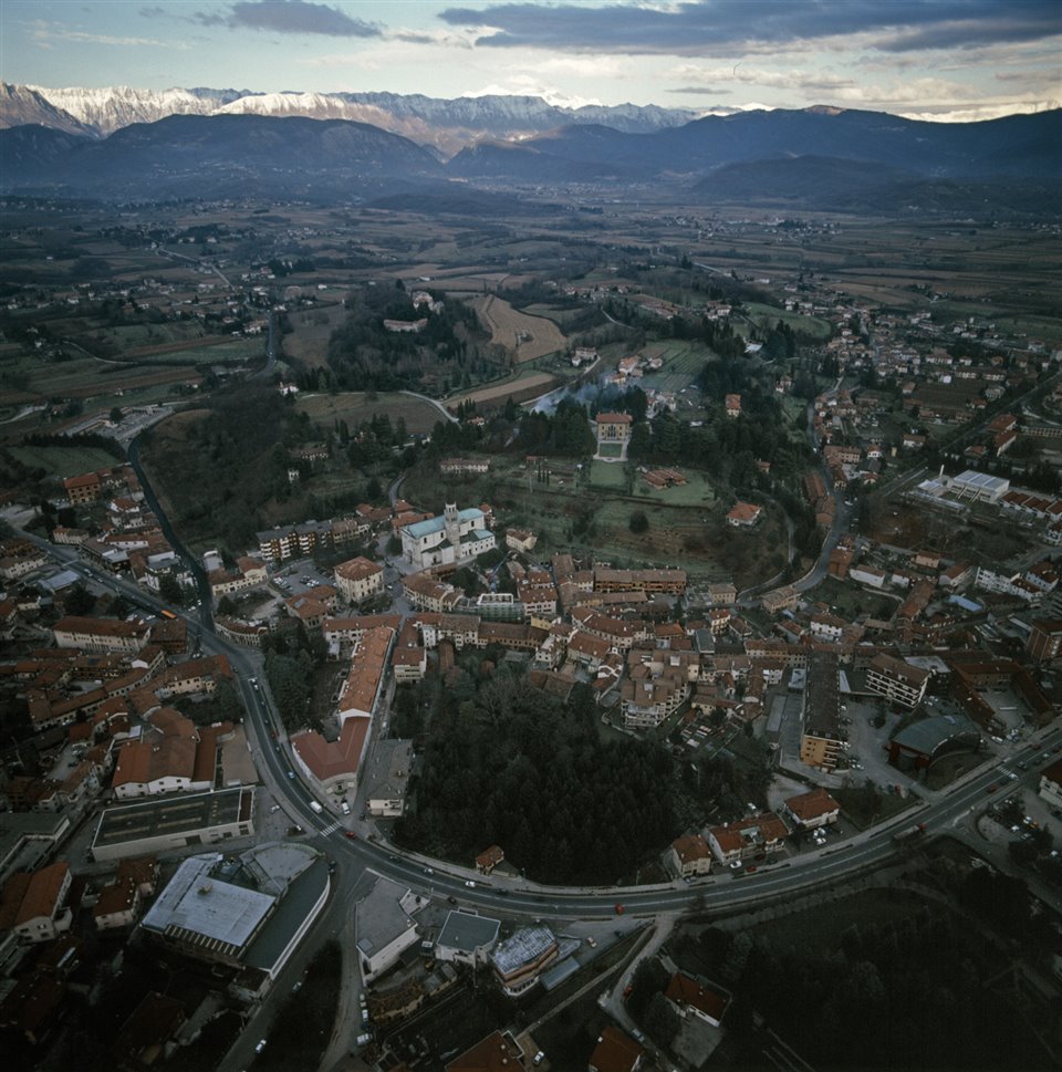 Veduta aerea dell’abitato di Tricesimo con la chiesa di San Pelagio (Duomo); sullo sfondo le Prealpi Giulie |