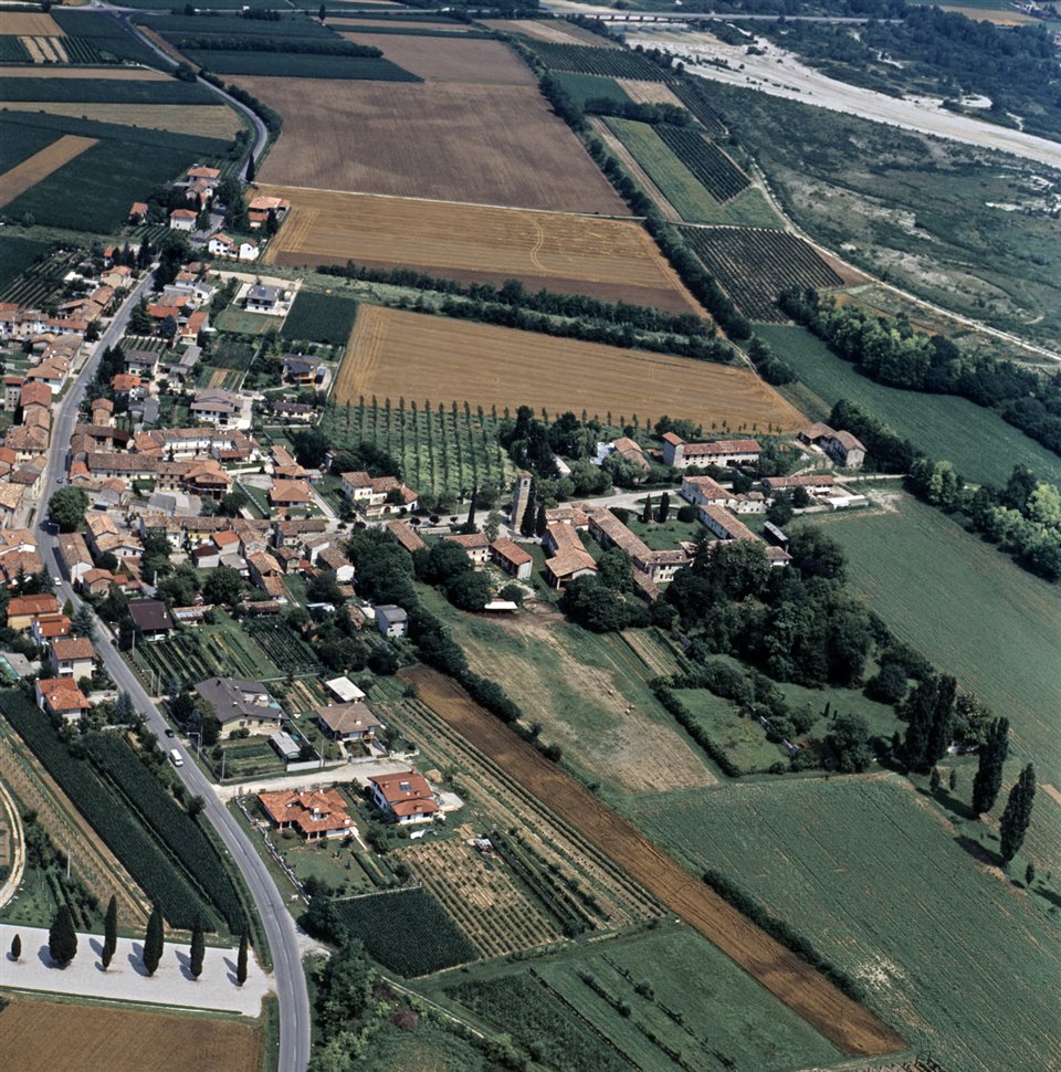 Veduta aerea della frazione di Nogaredo al Torre nel comune di San Vito al Torre con la chiesa di Sant’Andrea e la Villa Gorgo-Maniago; sulla destra il fiume Torre |