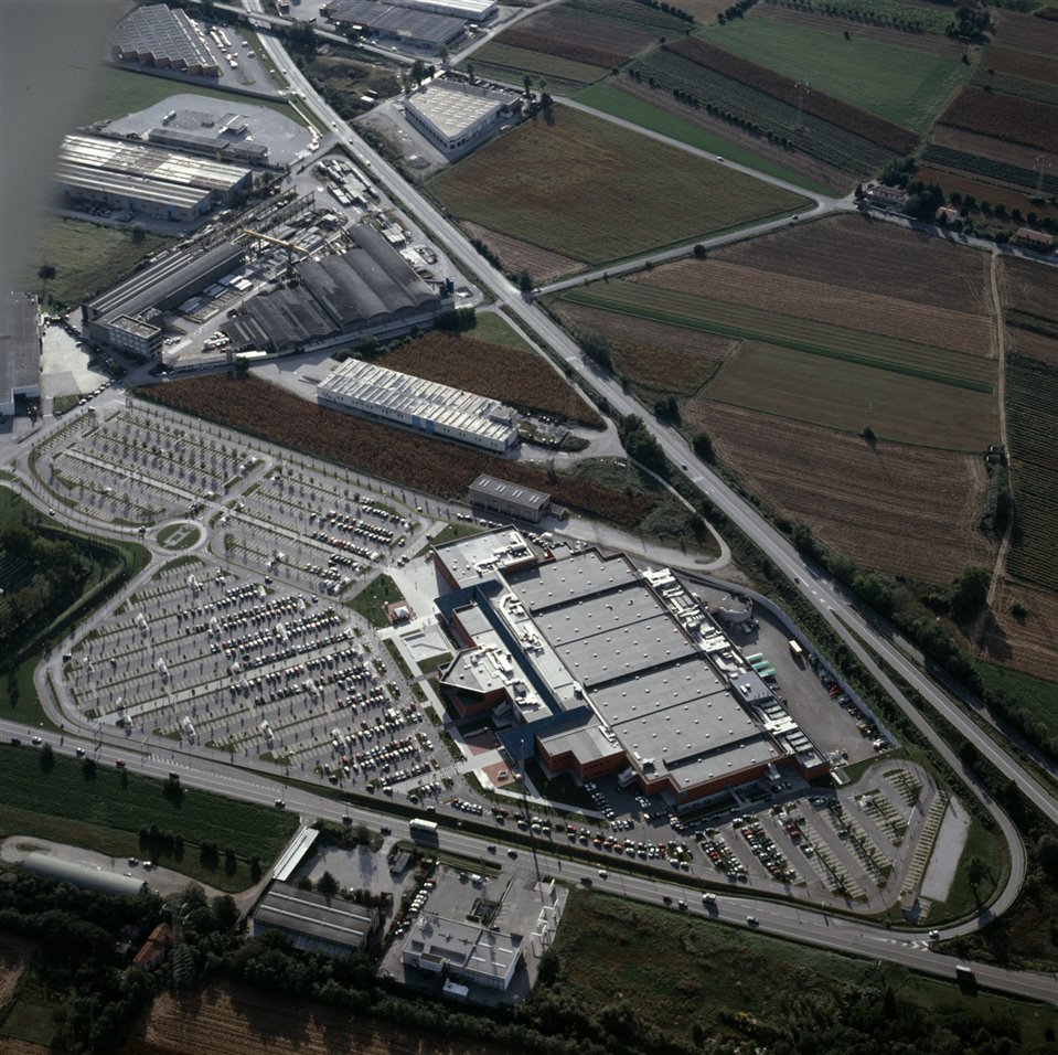 Veduta aerea del Centro Commerciale “Friuli” a Tavagnacco; in primo piano un tratto della strada provinciale 4 e al centro un tratto della strada statale 13 |