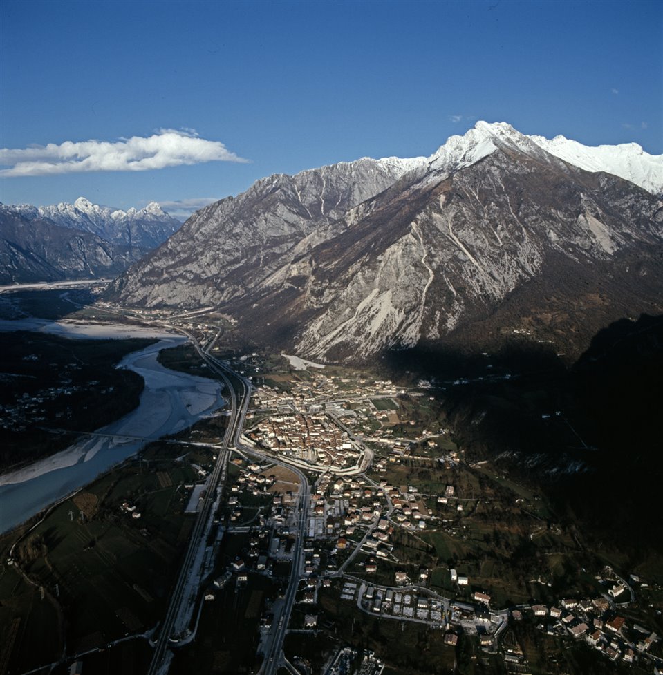 Veduta aerea dell’abitato di Venzone con il fiume Tagliamento, la linea ferroviaria Udine-Tarvisio, la strada statale 13 e le Prealpi Giulie |