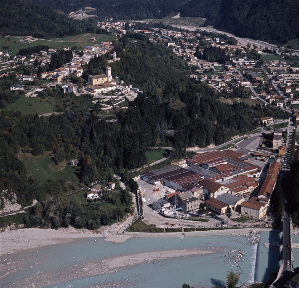 Veduta aerea del fiume Fella e dell’abitato di Moggio Udinese; in basso la cartiera Ermolli; sul colle l’abbazia di San Gallo |