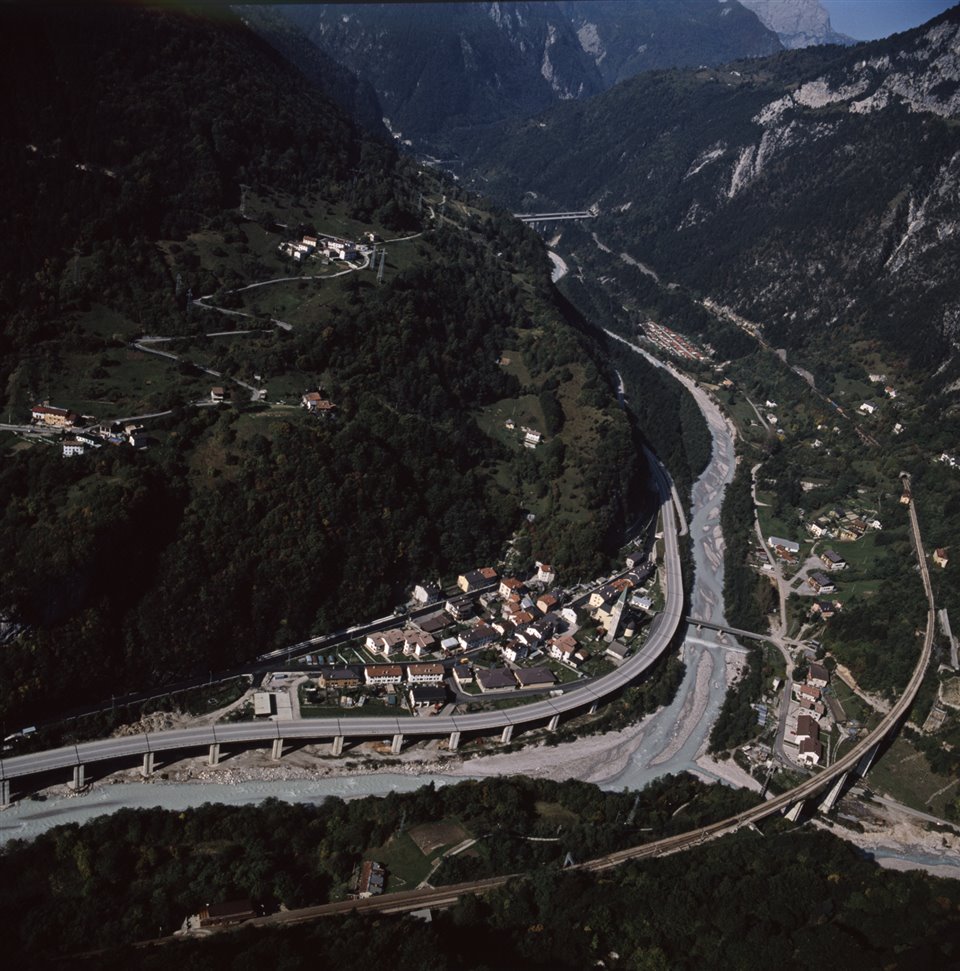 Veduta aerea dell’abitato di Dogna con la chiesa di San Leonardo, il fiume Fella con la strada statale 13 e il viadotto |