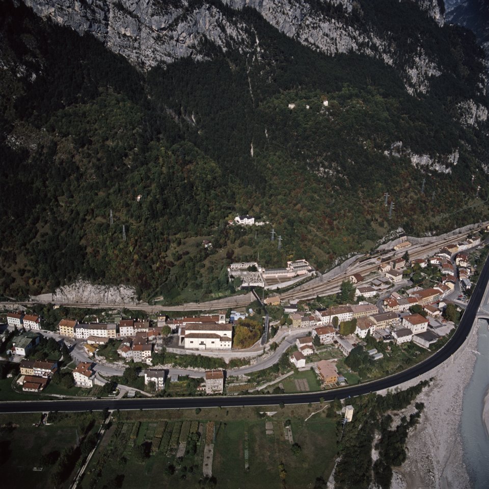 Veduta aerea dell’abitato di Chiusaforte, dell’autostrada A23 Palmanova-Tarvisio, dell’ex linea ferroviaria Udine-Tarvisio e del fiume Fella |