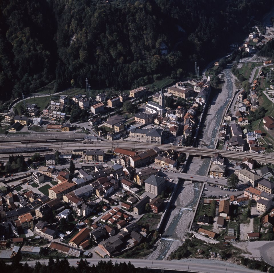 Veduta aerea dell’abitato di Pontebba con il fiume Pontebbana, l’ex linea ferroviaria Udine-Tarvisio e la chiesa di Santa Maria Maggiore |
