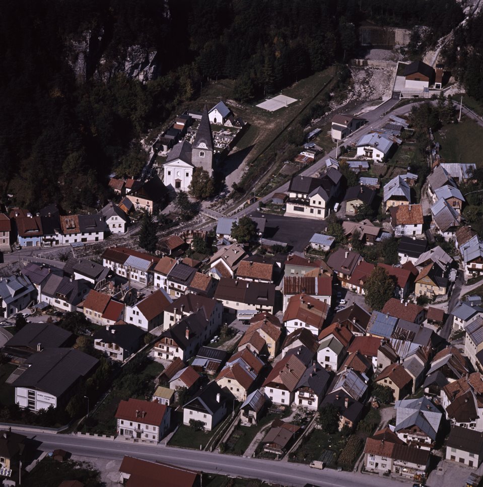 Veduta aerea della frazione di Ugovizza nel comune di Malborghetto-Valbruna con la chiesa dei Santi Filippo e Giacomo |