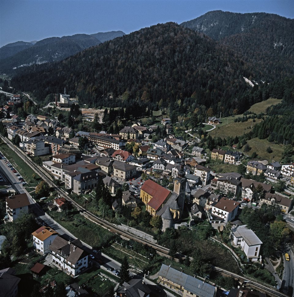 Veduta aerea dell’abitato di Tarvisio con la chiesa dei Santi Pietro e Paolo Apostoli, la strada statale 13 e l’ex linea ferroviaria Udine-Tarvisio; sullo sfondo le Alpi Carniche |
