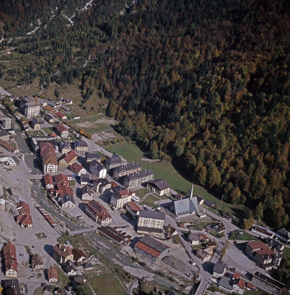 Veduta aerea della frazione di Cave del Predil con la chiesa di Sant’Anna |