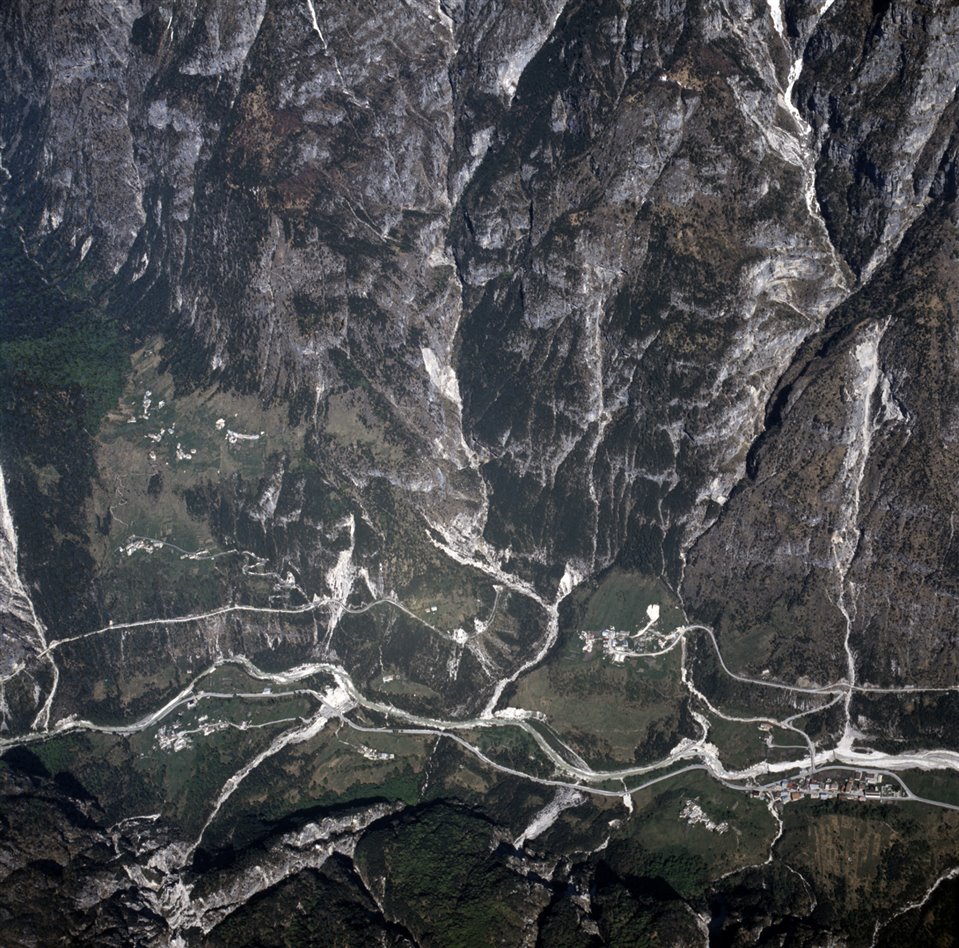 Veduta aerea delle Alpi Giulie e della frazione di Saletto nel comune di Chiusaforte |