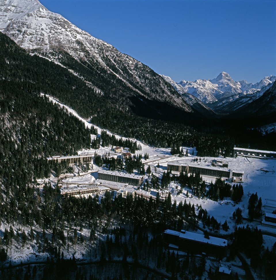 Veduta aerea della frazione di Sella Nevea nel comune di Chiusaforte; sulla sinistra parte del massiccio del Monte Canin |