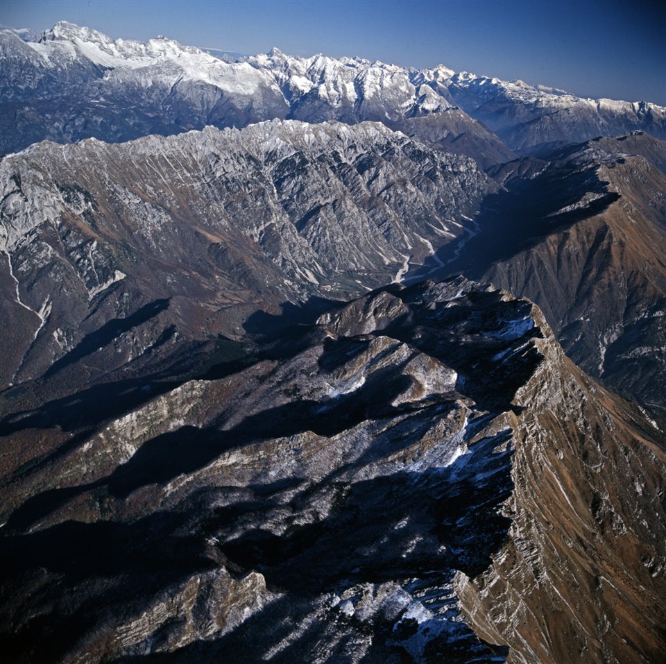 Veduta aerea delle Prealpi Giulie con al centro la Valle del Torre catena dei Monti Musi e in primo piano il Monte Chiampon |
