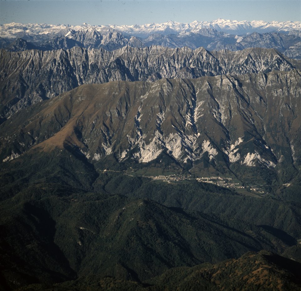 Veduta aerea delle Prealpi Giulie con al centro il Gran Monte e la frazione di Monteaperta nel comune di Taipana; in fondo i Monti Musi |