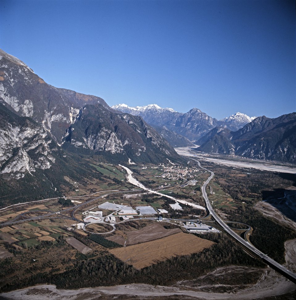Veduta aerea dell’abitato di Amaro e un tratto dell’autostrada A23 Palmanova-Tarvisio. In primo piano il fiume Tagliamento e sulla sinistra le Alpi Carniche, a destra il fiume Fella e in fondo le Prealpi Giulie |