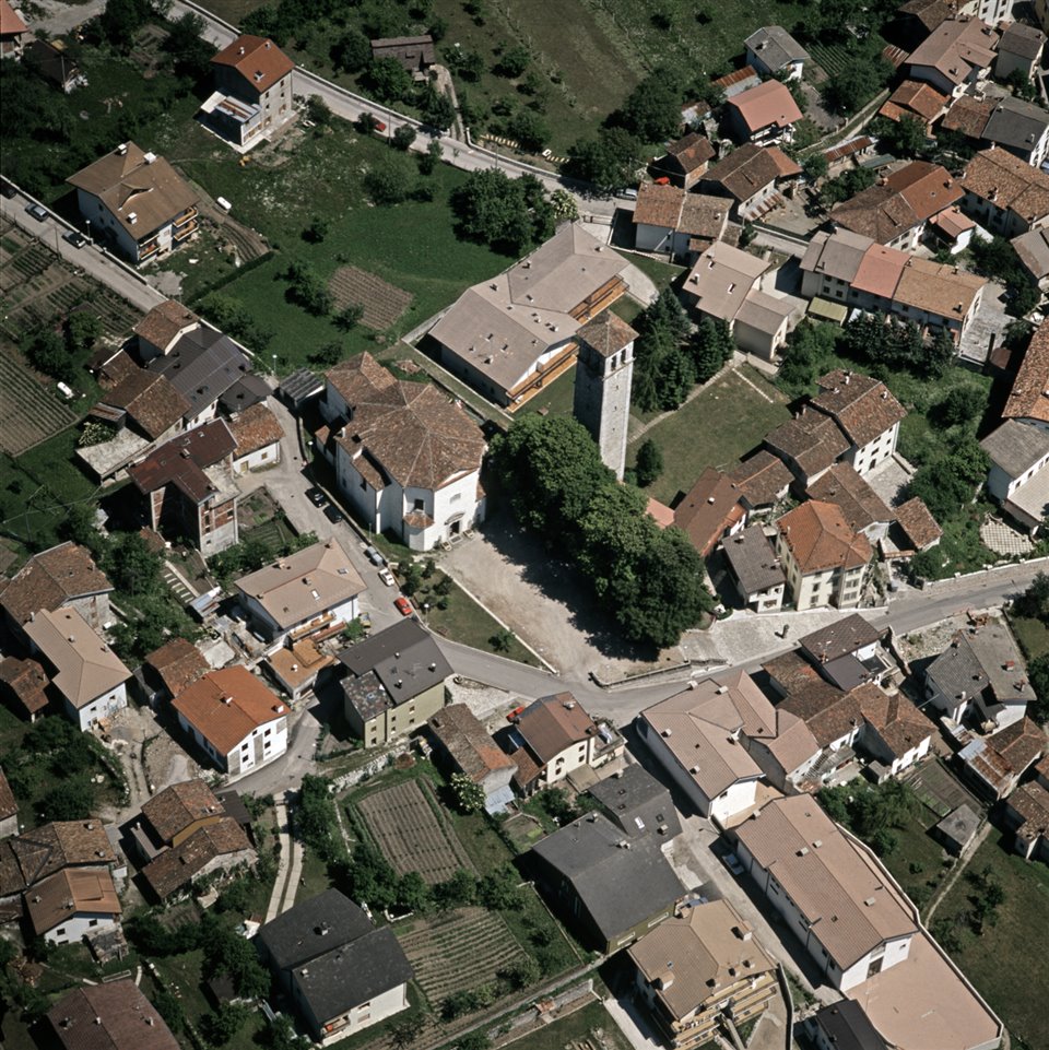 Veduta aerea della frazione di Piano d’Arta nel comune di Arta Terme con la chiesa di Santo Stefano |