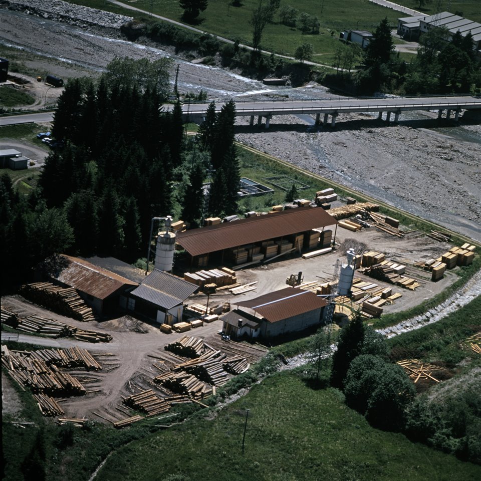 Veduta aerea di una segheria e di un ponte sul fiume But |