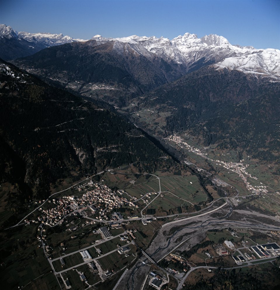 Veduta aerea dell’abitato di Sutrio, del fiume But e le Alpi Carniche |