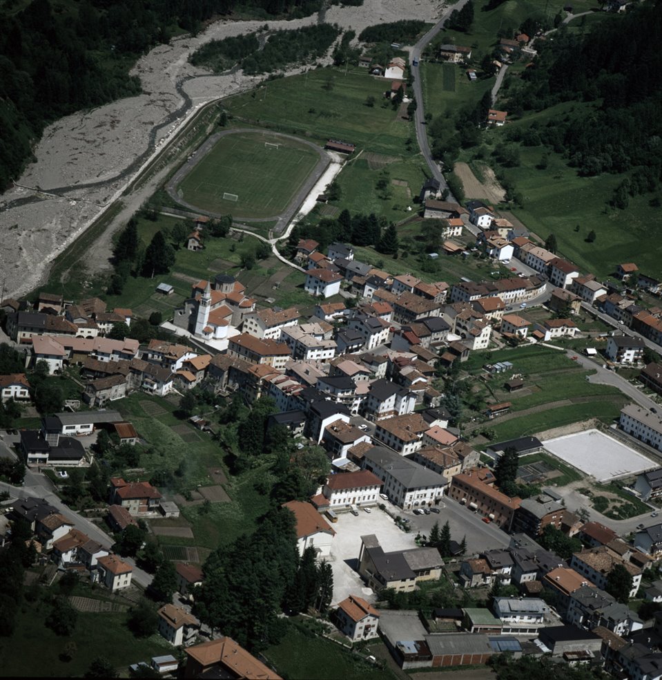 Veduta aerea dell’abitato di Paluzza con la chiesa di San Daniele Profeta, il campo sportivo comunale e il fiume Pontaiba |