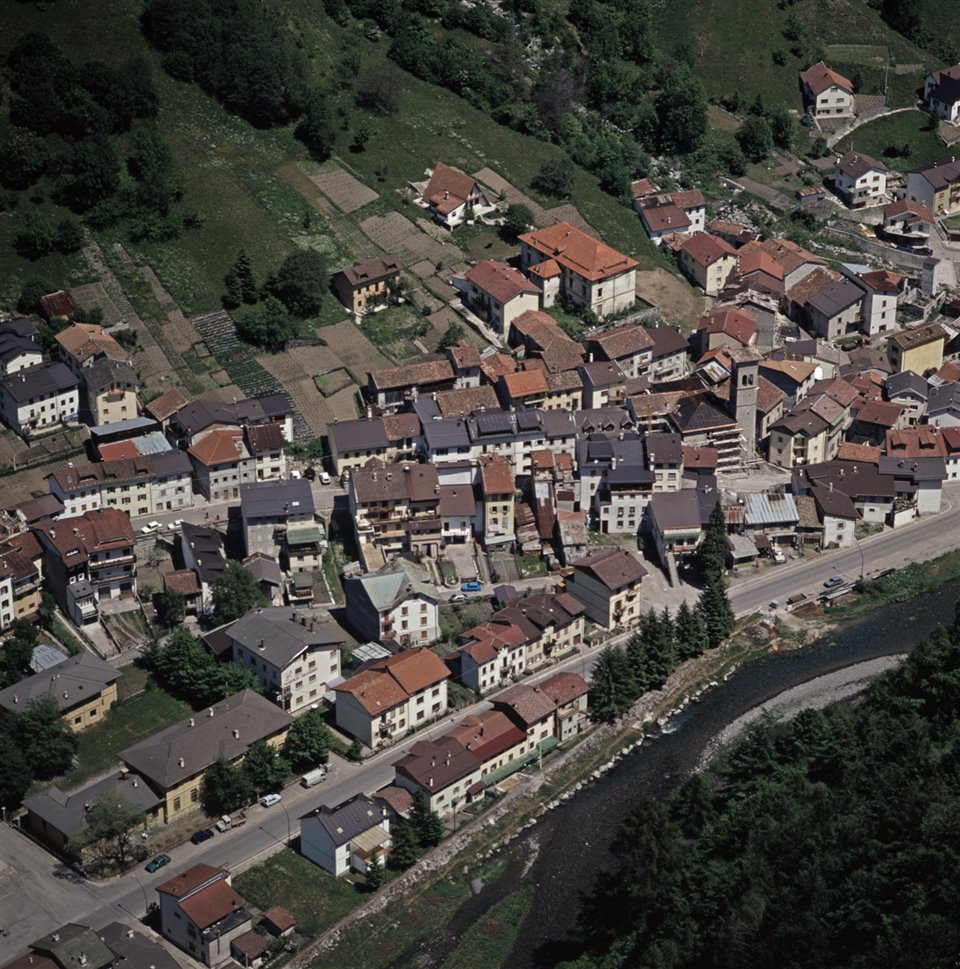 Veduta aerea della frazione di Timau nel comune di Paluzza con la chiesa di Santa Gertrude e il fiume But |