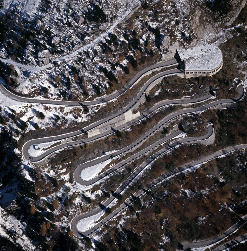 Veduta aerea della strada statale 52 bis che conduce al Passo di Monte Croce Carnico |