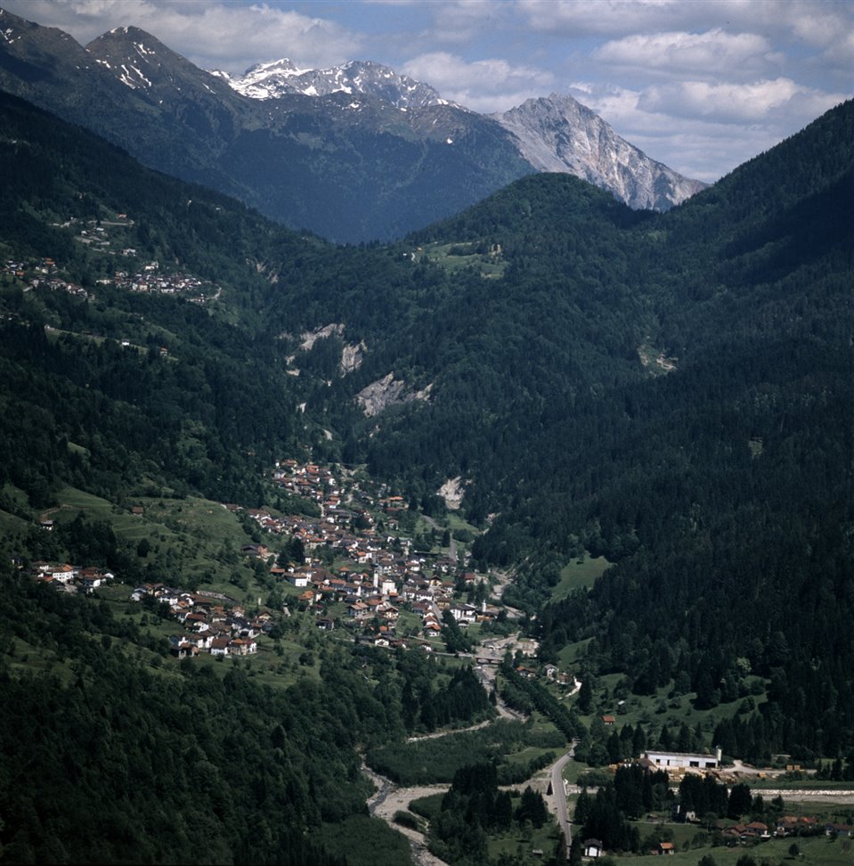 Veduta aerea dell’abitato di Treppo Carnico con la chiesa di San Nicolò Vescovo, il fiume Pontaiba e le Alpi Carniche |