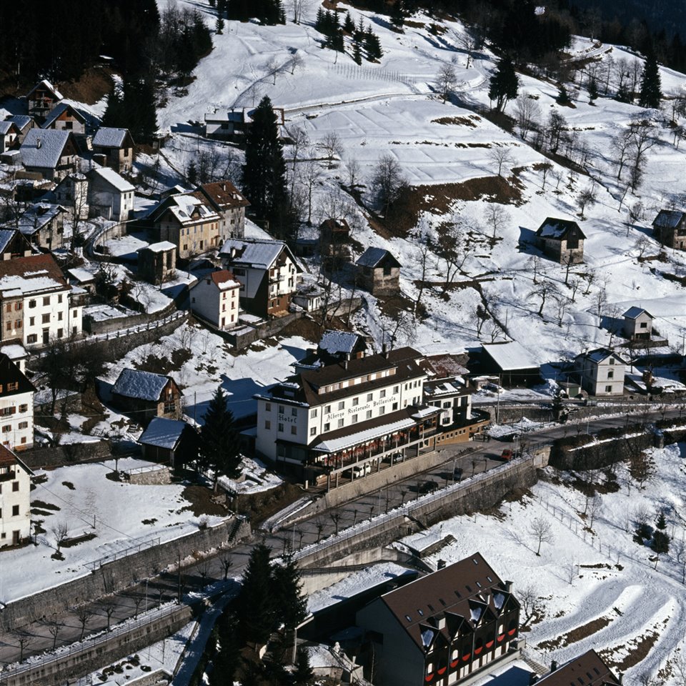 Veduta aerea dell’abitato di Ravascletto con l’albergo “Bellavista” |
